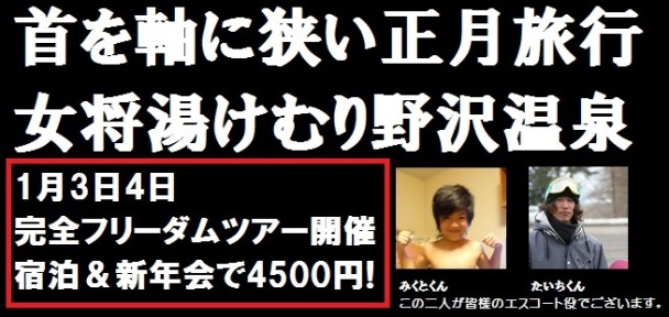 やってきました! まもなく2014年、NEWYEARツアーを今年も開催! 場所は! ここしかないでしょう! 木曽福島スキー場! いや、間違えました! 世界のスノーボーダーの憧れの聖地、 野沢温泉スキー場! 今年も年末年始は一級の寒波が来ます! 来てもらわないと困ります。 とゆうことで3日4日はみんなで滑りましょう! ABEAM特別エスコートの2人のイケメンズは キュートな草食系に見せかけたロールキャベツ男子、ミクトと 男に磨きを掛けたベーコン巻ウィンナー男子の 太一君です。 この二人に2日間、なんでも相談してください。 なんでもやります。 もちろん、ABEAM RIDER勢揃いします。 岡島、剛士、RYU、愛ちゃんなどなど。 費用5000円(ノンアルコーラーは4000円) *宿泊代金(朝夕食なし) *新年会費込み (リフト券は各自用意お願いします) 毎年恒例、宿一件丸ごと貸切ってます! 人数が少ないと面子丸つぶれなので是非参加してください! 3日、AM8時30分 野沢温泉柄沢ゲレンデ券売所前集合 (間違えて木曽福島スキー場に行かないように!スノボ禁止です) リフトにみんなで乗車後、バインを装着した順に解散。 各自滑りを堪能したのち、宿のPM8:00からの新年会で合流とゆう 完全フリープランツアー。 4日は自由起床、自由解散! 雪が降らなきゃすぐに帰宅もOK! PARKをがっつり流すもOK! SURFERなら日本海に突撃OK! とにかく、新年にみんなで集まって楽しく騒ぎましょう! 【ご注意:2日間の行動は完全自由です。パウダーコースなどもたくさんありますが、 滑走に関しては責任を持ち完全自己完結できる方のみお願いします。普通のコースでも十分楽しいので無理は禁物!】 |