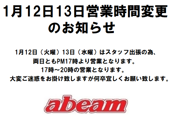いつも誠にありがとうございます。 1月12日(火曜)13日(水曜)はスタッフ出張の為、 両日ともPM17時より営業となります。 17時〜20時の営業となります。 大変ご迷惑をお掛け致しますが何卒宜しくお願い致します。 |