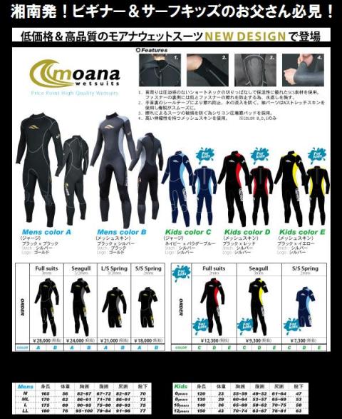| MOANA WETSUITS取り扱い開始!【ロープライス&ハイパフォーマンス】 湘南発、国産生地を使用し極限までローコストに徹し、パフォーマンスを高めた『MOANA』取り扱い開始! 一押しのスターター(ビギナー)に絶好調の湘南発のウェットスーツ『MOANA』のスーパーバリューウェットスーツ。 世界的にも最高水準の高品質な国内生産生地を使用したハイコストパフォーマンスウェットと言えます。 !スターターはもちろん、カムバックサーファーなども手軽に購入ができ、高い品質に満足していただけるウェットスーツです。 【サイズ】身長+-4cm、体重+-4kgを目安にしてお選び下さい。サイズはあくまでも目安ですので、ご理解願います。 ■首周りは圧迫の少ない切りっぱなしのショートネックを採用。ファスナーの裏側はファスナーと肌が擦れないような仕組みになっています。 ■袖パーツは良く伸びるストレッチスキンを採用。 ■膝パットは擦れによるウェットのダメージを防ぐため、シリコン圧着パットを採用。 ■カラーMENS B、KIDS D、KIDS Eは上半身メッシュスキンを採用。 FULLSUITS 26000円 シーガル 22000円 L/S SPRING 19800円 S/S SPRING 16900円 KIDS FULL 11600円 KIDSシーガル 8780円 KIDSスプリング 6890円 上記特別メーカー価格よりABEAMで更にお安くなった価格です! 初心者の方、またSURFKIDSを持つパパママの財布に強い味方! 物はマジでいいです! (メーカー注文品ですのでご注文していただき数日要します)